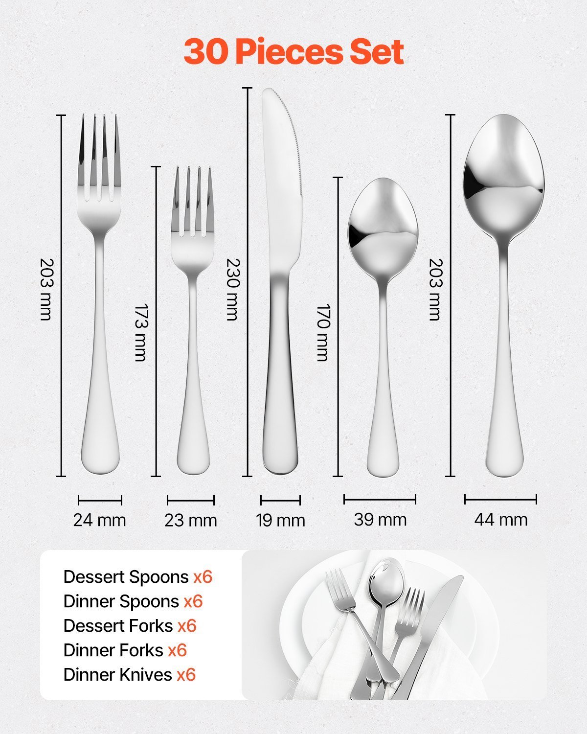30-Piece Flatware Set: This silverware set includes 6 dinner forks, 6 dinner spoons, 6 dinner knives, 6 dessert forks, and 6 dessert spoons, making it an essential item for both home and restaurant use. Whether for everyday meals, dinner preparation, or parties, this flatware set is an indispensable dining tool